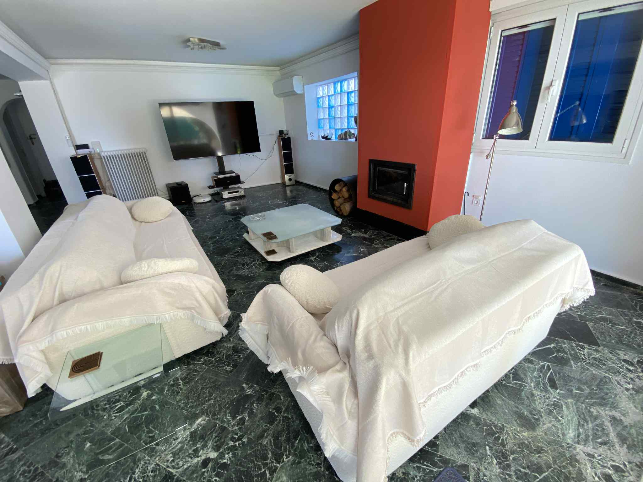 The house has the main entrance from the coastal Avenue of Athens Sounio, with its own garden, parking for at least 4 cars and a private pool. It consists of 3 bedrooms, two of them on the upper floor with double beds and separate bathrooms. The third on the ground floor with two single beds and also a separate bathroom. It also has a fourth room that can be used as an office or a facility room. Air conditioning in the two bedrooms on the floor and one in the living room Ceiling fans in two of the three bedrooms. A large living room with 75' smart tv, sofas etc., dining room for 8 people, dishwasher, microwave, kitchen with gas hobs, refrigerator, oven, washing machine and obviously wifi in all areas. An outdoor living room for 8 people is on the upstairs terrace. There is also a gas grill for BBQ and of course a table, chairs etc. for lunch/dinner outside.
